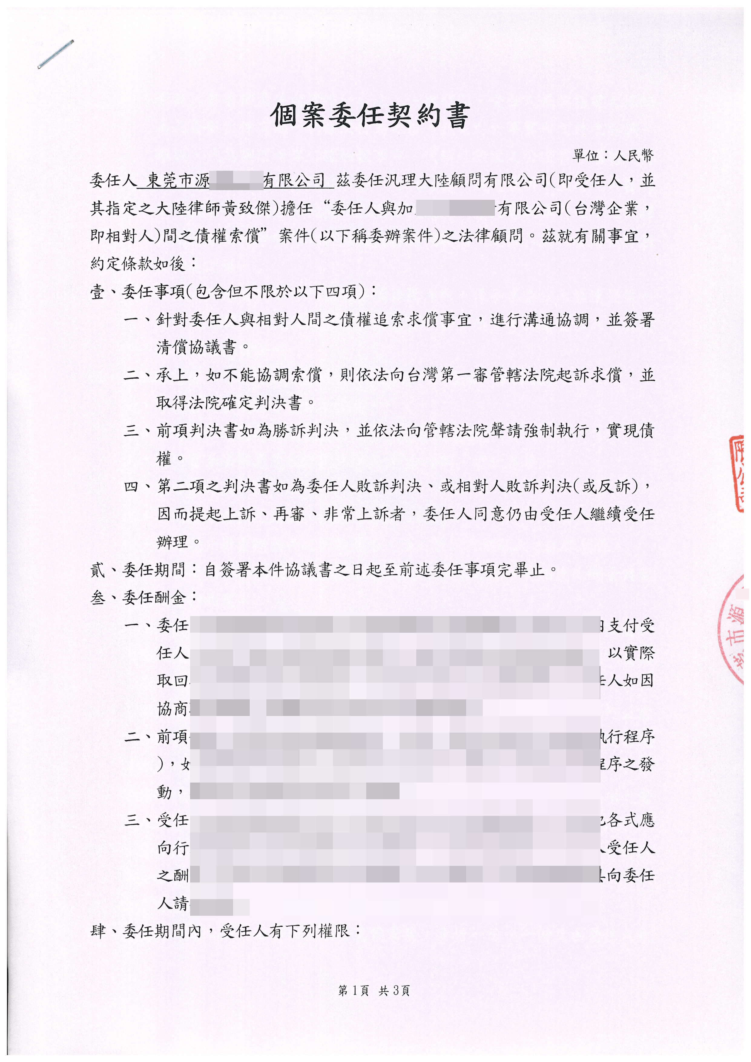 兩岸債權 – 東莞源X合同糾紛 / 成功案例 / 作者: 黃致傑 Table of Contents Toggle 兩岸債權- 債務 合同糾紛台籍大陸律師黃致傑 – 兩岸債權 – 合同糾紛 債務追償【案件類型】兩岸債權【案件概述】李先生代表東莞市源X公司,於2017年3月前來委託我處尋求協助,起因合作之台灣加X公司惡意卡扣貨款,履次聯繫皆不回覆,李先生不滿加x公司每每要求將品牌利潤最大化,爾後卻把責任歸屬推向源X公司,遂委託黃律師對加X公司進行債權追索求償事宜。【最終結果】經律師與我處法務主任積極溝通協商後,加X公司願意返還卡扣貨款金額,此案於隔月結案。延伸閱讀 : 東森新聞雲-台商西進小心踏入合同陷阱 兩岸債權- 債務 合同糾紛 台籍大陸律師黃致傑 – 兩岸債權 – 合同糾紛 債務追償 【案件類型】 兩岸債權 【案件概述】 李先生代表東莞市源X公司,於2017年3月前來委託我處尋求協助,起因合作之台灣加X公司惡意卡扣貨款,履次聯繫皆不回覆,李先生不滿加x公司每每要求將品牌利潤最大化,爾後卻把責任歸屬推向源X公司,遂委託黃律師對加X公司進行債權追索求償事宜。 【最終結果】 經律師與我處法務主任積極溝通協商後,加X公司願意返還卡扣貨款金額,此案於隔月結案。 延伸閱讀 : 東森新聞雲-台商西進小心踏入合同陷阱 分享