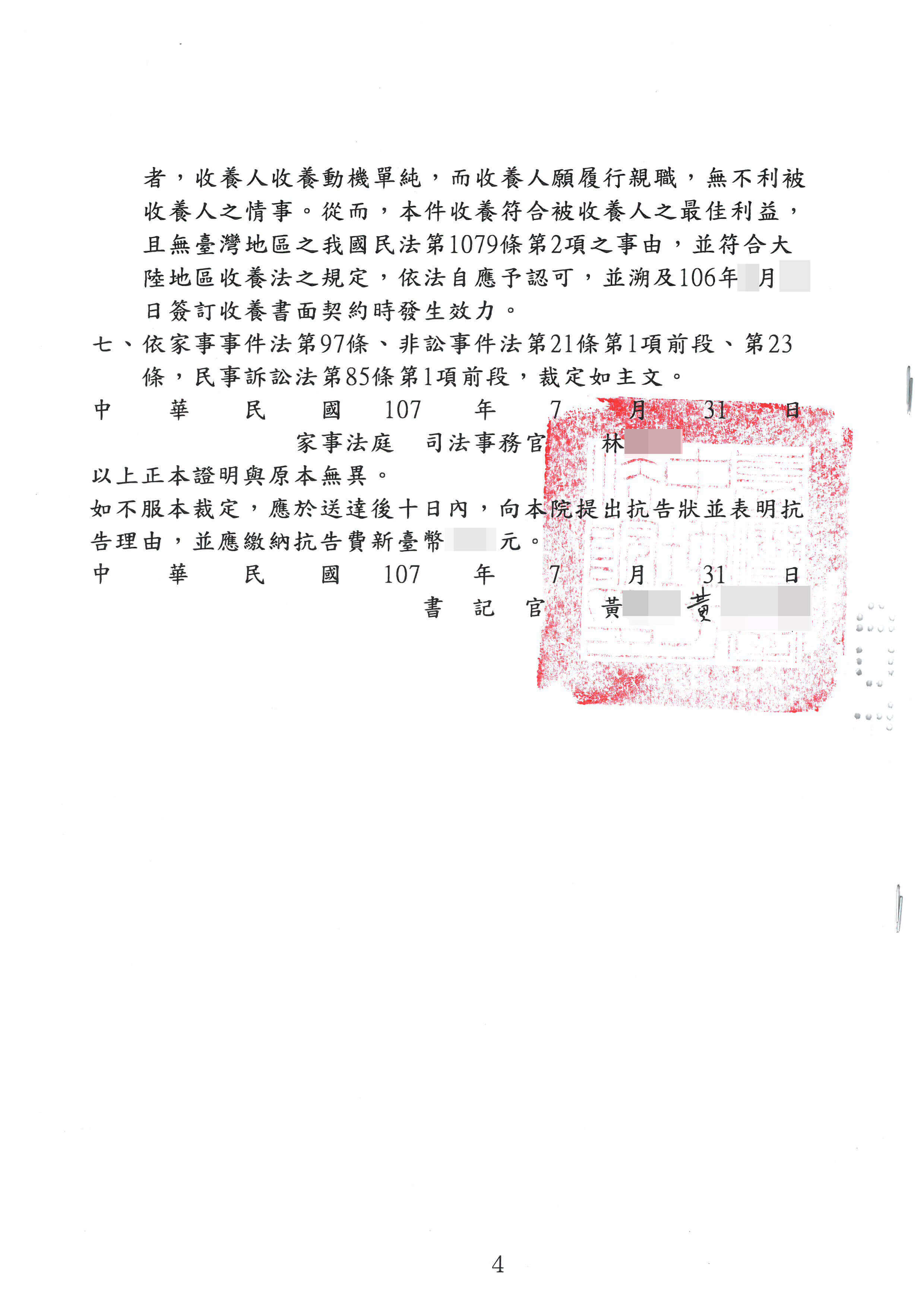經我處積極與有關公證機構協調、並順利取得公證文件、且返台辦理驗證後,重新向法院提出認可收養聲請,本案終於在近日獲得法院認可裁定,此案圓滿結束!