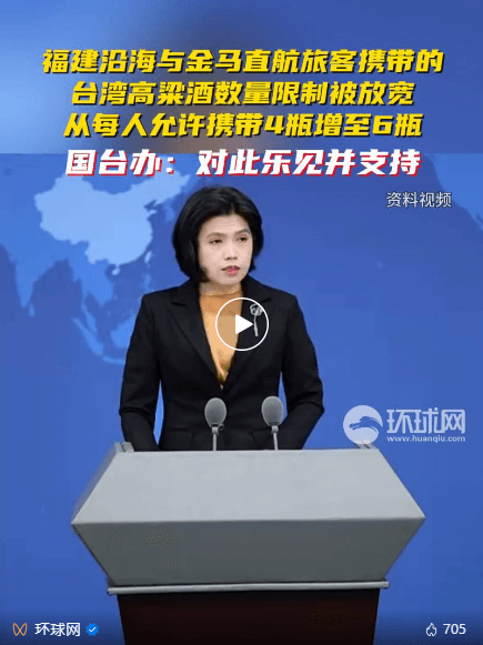 國務院台辦發言人朱鳳蓮12月25日表示,相關地方海關當天公告實施放寬福建沿海與金馬直接往來航線旅客攜帶的台灣高粱酒數量限制,從目前每人允許攜帶4瓶增至6瓶。我們對此樂見並支持。
