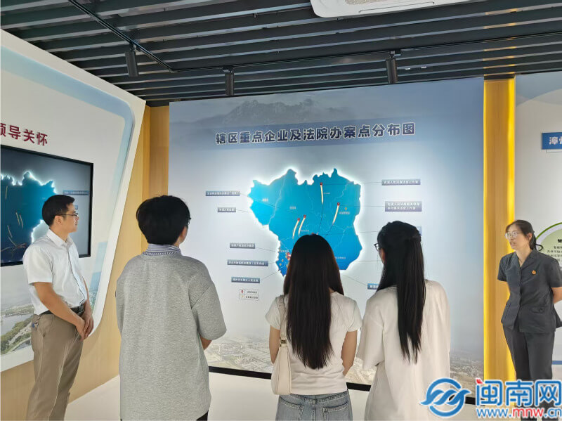 在沈緒璐法官的帶領下,實踐團隊參觀學習了涉台案件辦公室,長泰區法院法治化營商環境展示基地等區域,詳細了解了長泰區法院在服務轄區企業發展,優化營商環境方面的創新舉措和典型案例。在涉台企業案件裡,沈法官強調,要堅持兩岸一家親的理念,秉持「三項機制、三類團隊、三級連動、三語服務」的「四個三」工作模式,積極建構涉台矛盾糾紛多元化解平台,建立完善台企風險檔案,定期進企業以案說法,為台企發展營造良好的法治環境。根據司法局和長泰區人民法院的數據回饋,在法院的積極引導下,長泰區涉台訴訟案件逐年呈下降趨勢,最近幾年穩定在每年10件以內,台商台企依法經營的意識和防範風險的能力逐漸增強,對人民法院司法服務和保障的滿意率不斷提升。