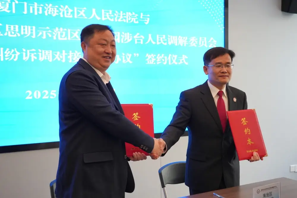 今年,「涉台糾紛訴調對接合作協議」簽約儀式在思明區舉行。此次升級,由海滄區人民法院與及家園涉台人民調解委員會聯合完成,創新地將案件受理、分配及調解流程搬到線上,實現跨省、遠程調解功能。平台會根據案件類型自動配對一名台胞調解員、一名陸胞調解員,並由律師協助,確保調解過程專業、規範。