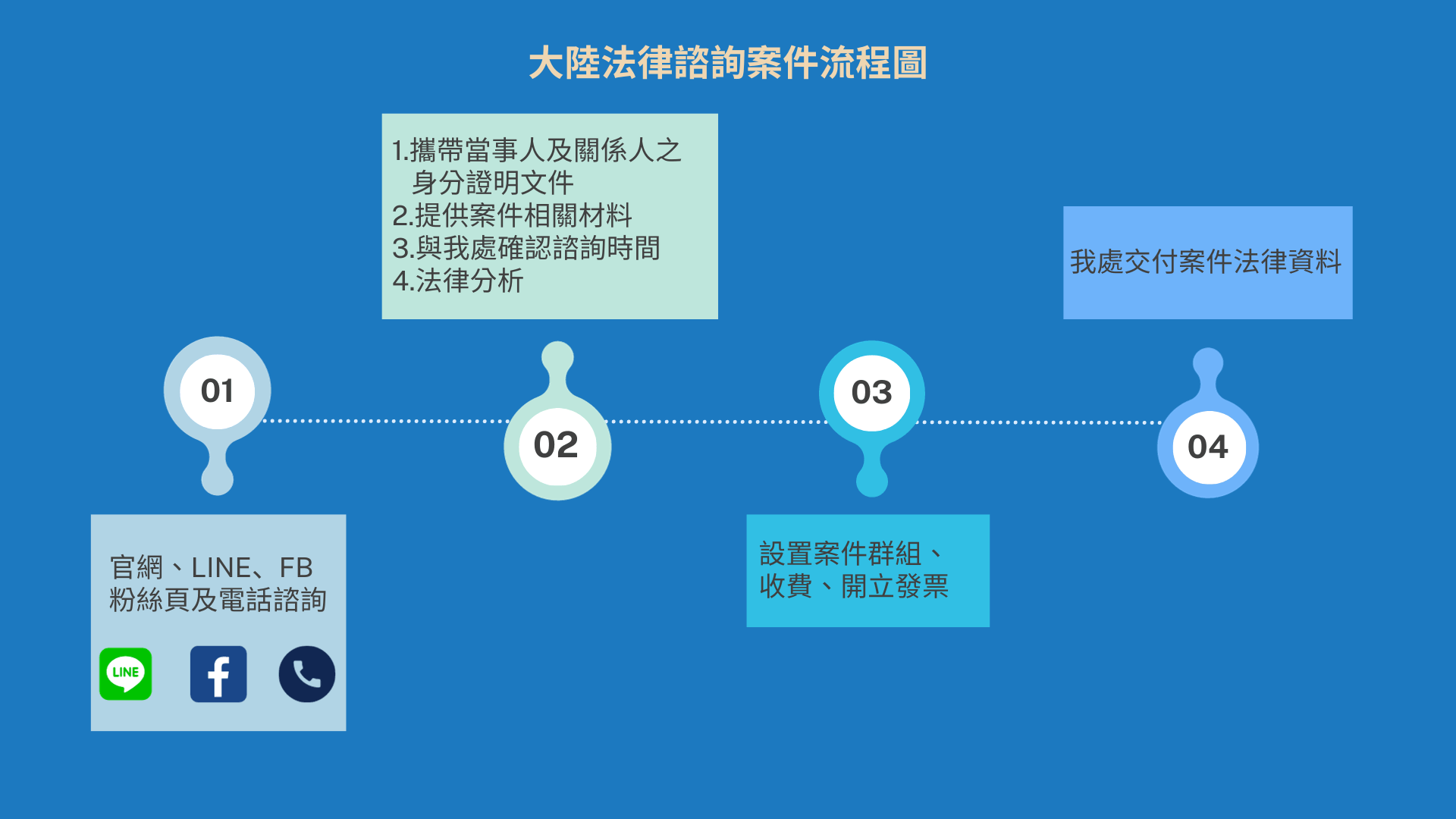 當民眾們遇到法律問題時,往往著急得不知該如何是好,為提供民眾更貼心的服務黃致傑律師辦公室提供了簡易的諮詢流程圖,除了讓大家能夠了解諮詢前所需要準備的東西外,也能夠知道諮詢時我們提供的法律服務有哪些,讓我們一起更有效率的協助您解決法律問題!
